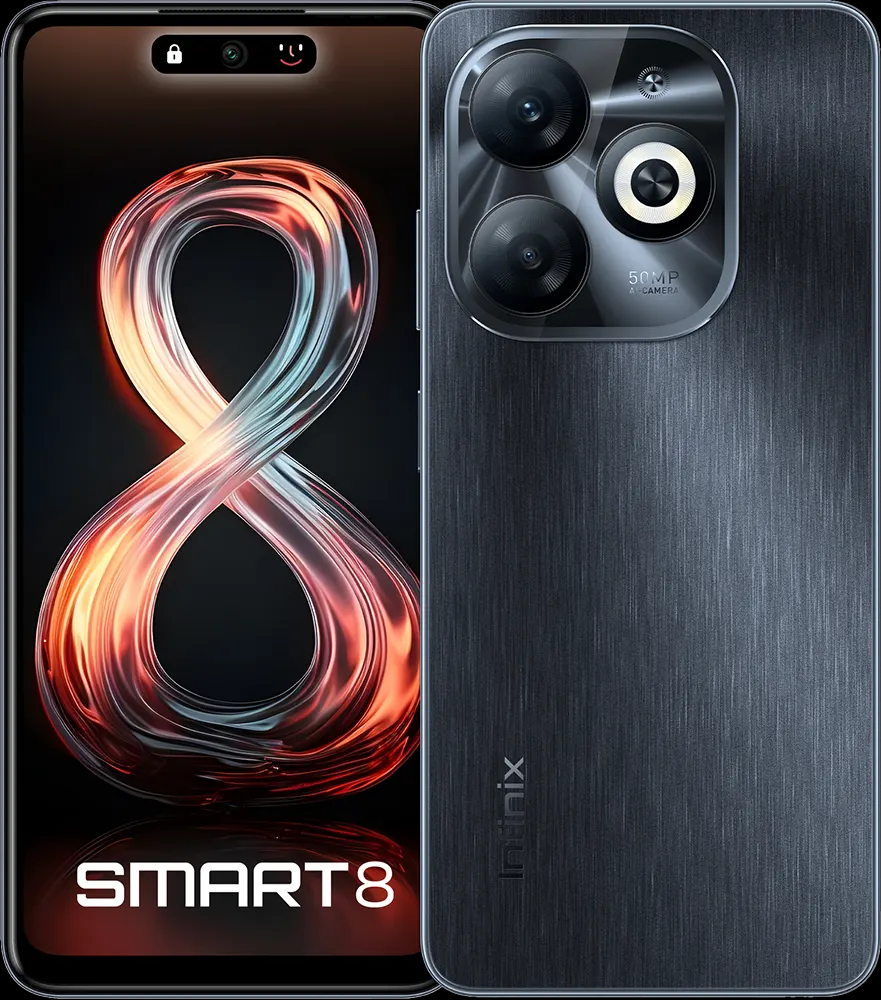 هاتف Infinix Smart 8 يأتي بتصميم أنيق وعملي، مزود بشاشة 6.6 بوصة من نوع IPS LCD بدقة HD+ (720×1612 بكسل) مع ثقب للكاميرا الأمامية، ويوفر تجربة مشاهدة مريحة وواضحة.